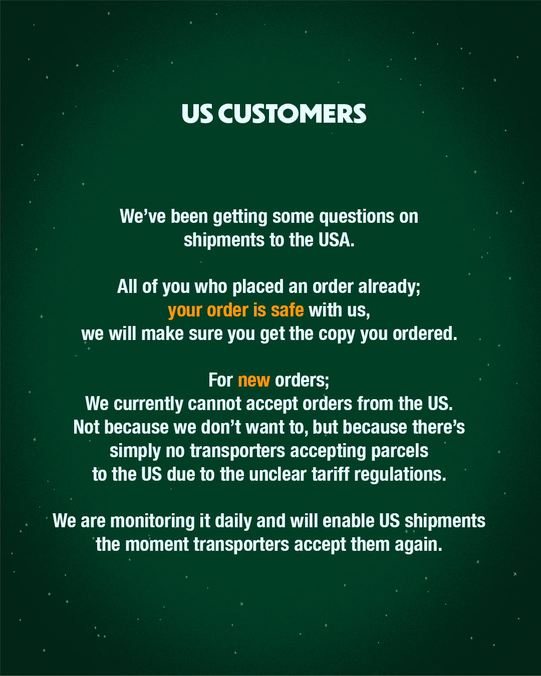 WE CURRENTLY CANT ACCEPT ORDERS FROM USA. ORDERS ALREADY PLACED WILL BE PROCESSED.